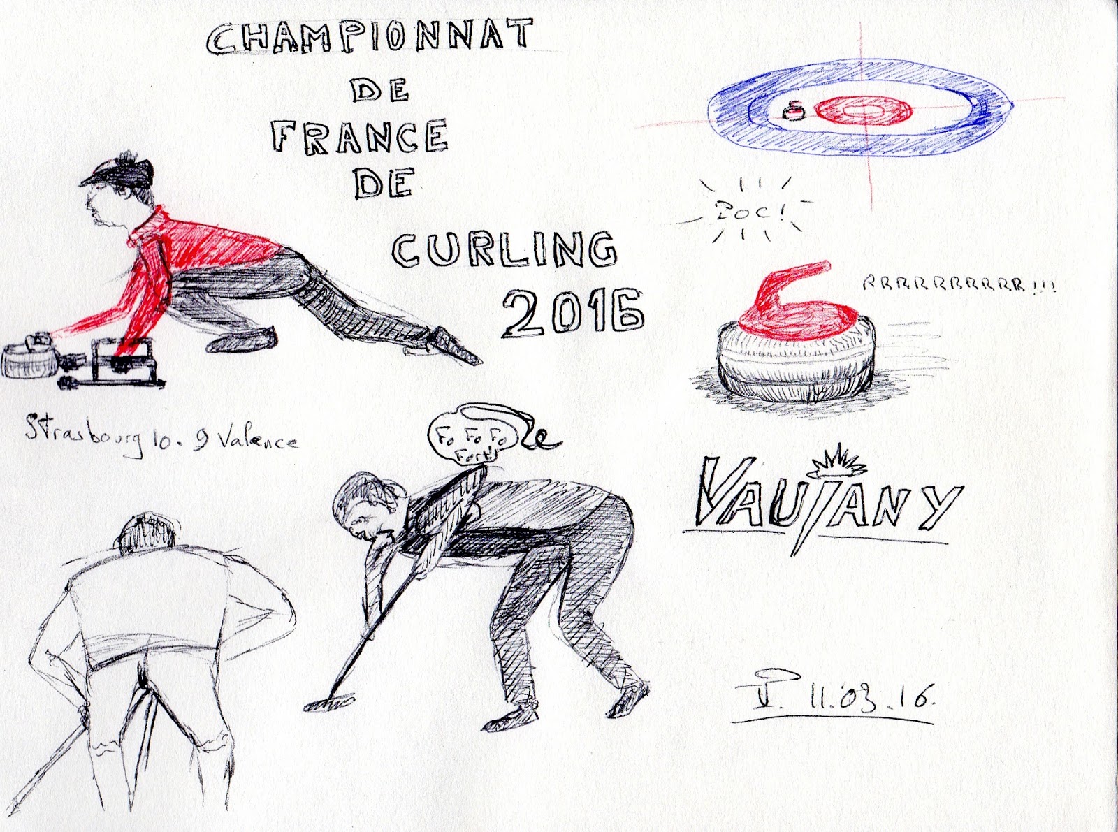 Pendant 3 jours ( 11, 12, 13 mars) se tient le Championnat de France de Curling. Hier pour la première journée j'y suis allé faire un tour et essayé de croquer un peu. Ben c'est pas évident. Et pis y avait 3, 4 copains et de la bière pour corser la chose.